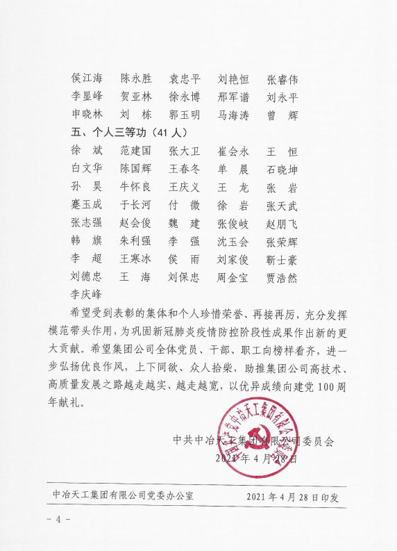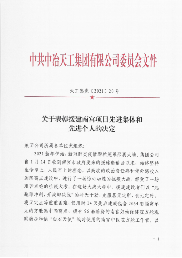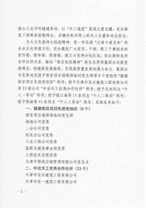 2021年春節將至,新冠肺炎疫情籠罩邢襄大地。天津市寶興建筑工程有限公司受到中冶天工集團有限公司邀請積極投入到南宮方艙隔離點的建設中,本著時間就是生命的原則,我公司在2天之內積極組織50余人參與到方艙基礎施工,地面混凝土澆筑等多項土建施工。在這場會戰的大考中,全體施工人員克服居無定所、食不定時、寢無定點的種種困難,僅用14天就完成2064套隔離單元方艙的土建施工任務。公司全體參戰人員的辛勤付出得到中冶天工集團有限公司的一致肯定。公司被授予“中冶天工優秀合作伙伴”